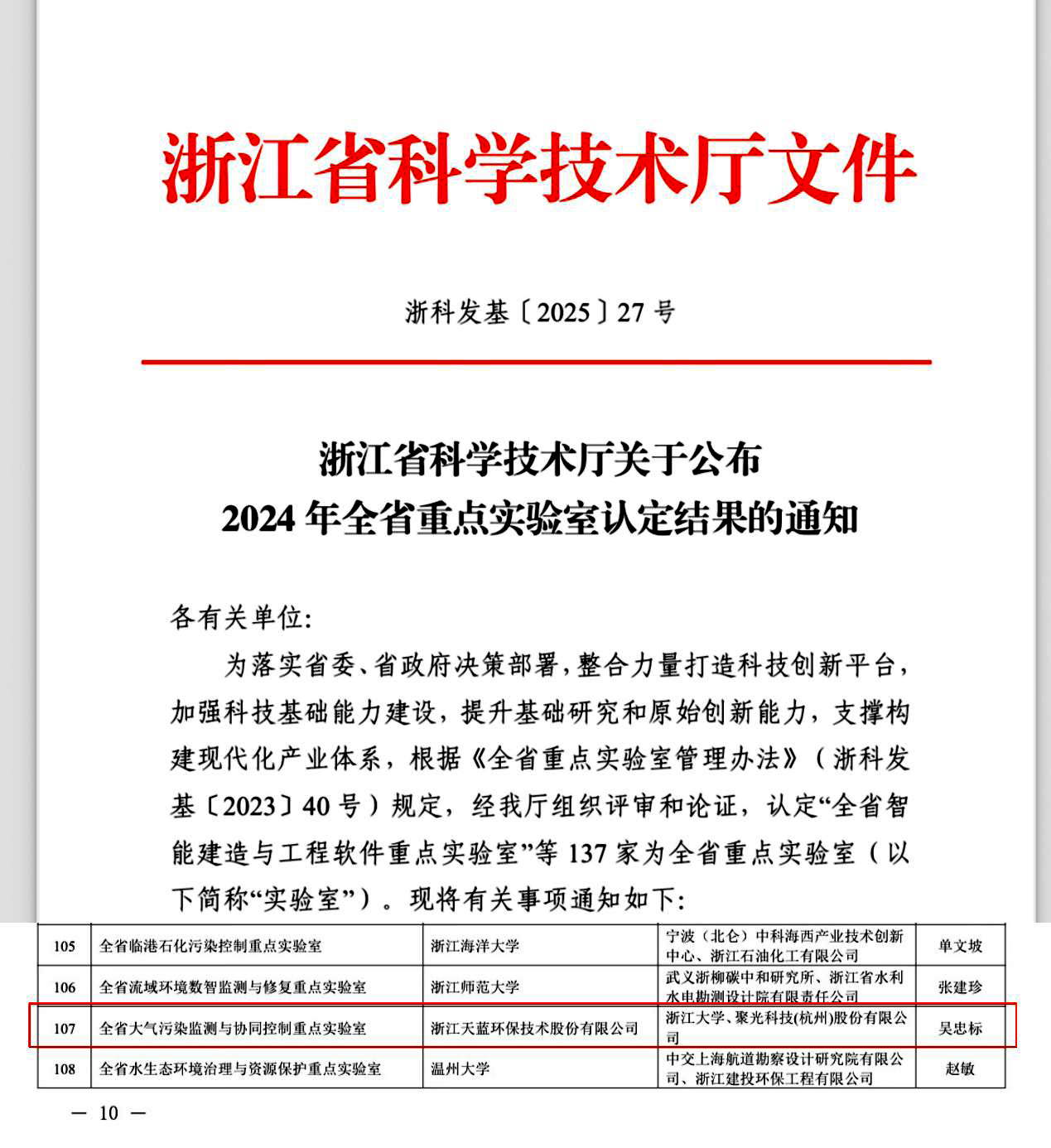 2025年6月4日,浙江省科技廳發(fā)布《浙江省科學技術廳關于公布2024 年全省重點實驗室認定結果的通知(浙科發(fā)基〔2025〕27號)》,由浙江天藍環(huán)保技術股份有限公司牽頭,浙江大學和聚光科技(杭州)股份有限公司共建的“全省大氣污染監(jiān)測與協(xié)同控制重點實驗室”獲批組建,成為全省環(huán)境領域唯一以企業(yè)牽頭建設的省級重點實驗室